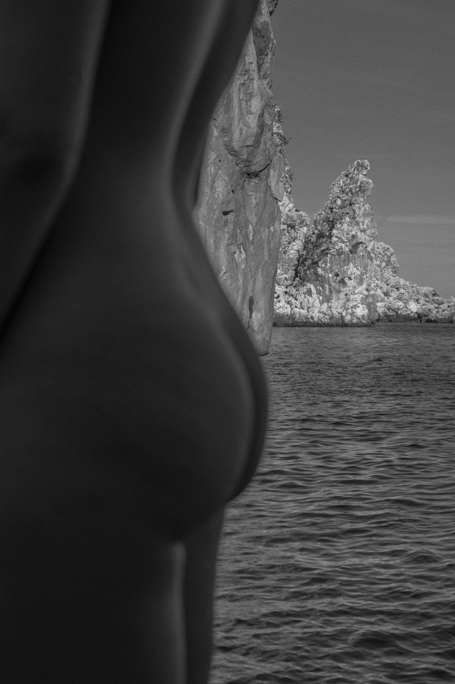 Amidst the play of contrasts between the timeless black-and-white waves and the delicate skin of the depicted figure, this photograph invites contemplation on the ephemeral nature of existence and the timeless bond between mankind and nature.